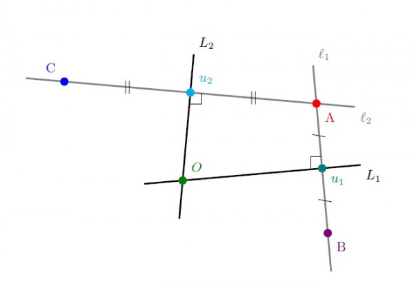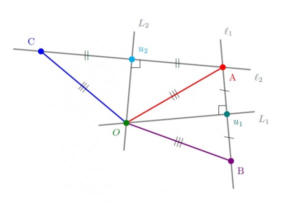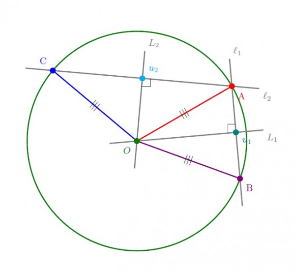 Paralel olmayan iki doğru biricik bir noktada kesişirler. Bu bilgi ile $L_1$ ve $L_2$ doğruları biricik bir $O$ noktasında kesişir, ve bu nokta $A$, $B$ v e $C$ noktalarına eşit uzaklıktadır.