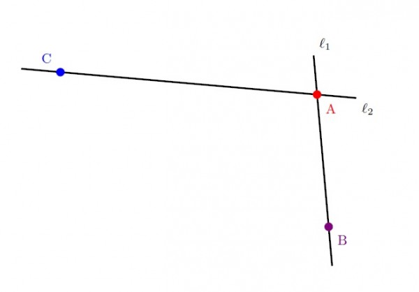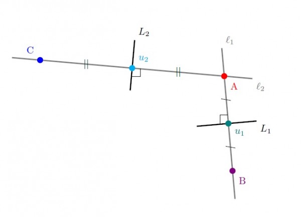 $A$, $B$ ve $C$ doğrusal olmadığından $\ell_1$ ve $\ell_2$ paralel doğrular değildir. Paralel olmayan doğruların dikleri de paralel değildir. Bu nedenle $L_1$ ve $L_2$ doğruları da paralel değildir.