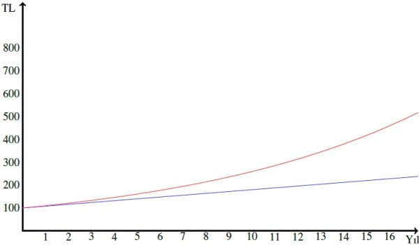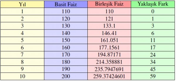 Bu bir yılın sonunda basit faiz veren kuruluş ana paranızı $100$ TL olarak düşünmeye devam ederken birleşik faiz veren kuruluş ana paranızı $100$ TL olarak değil de $110$ TL olarak düşünür.